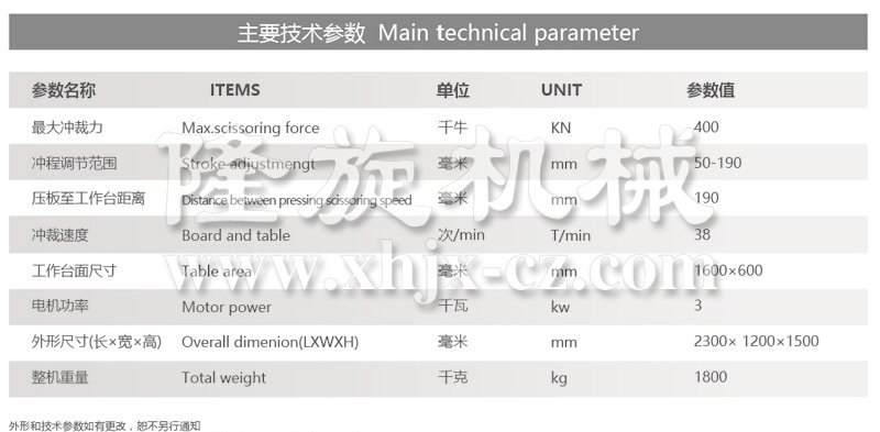 XH-XLJ400型液壓平面下料機主要適用于輕工系統(tǒng)的皮革,塑料橡膠、制鞋、服裝、制盒等行業(yè)的不同寬度及形狀的原材料裁切成型。同時主要用于切割集裝袋上所需要的相關(guān)部件,如涂完膜之后的底,蓋布上的進、出料口,拉筋袋拉筋部件的橢圓形進料口。并可將裁剪后剩下的涂膜布邊角料進行再次裁剪利用,有效的利用布料。